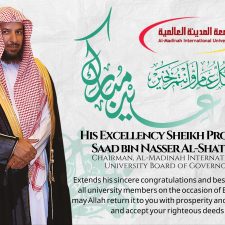 His Excellency Sheikh Professor Dr. Saad bin Nasser Al-Shathri, Chairman of Al-Madinah International University's Board of Governors, extends his sincere congratulations and best wishes to